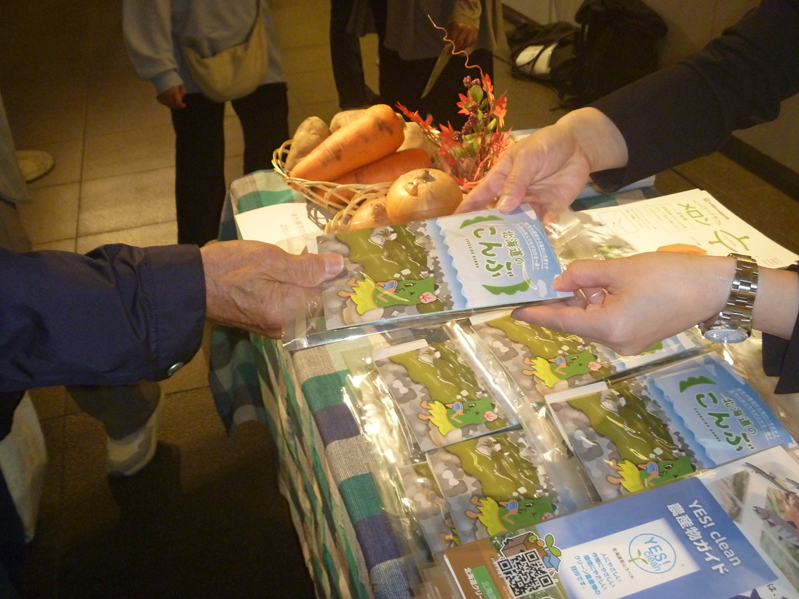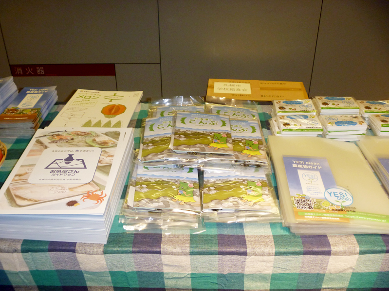 本給食会のブースでは、北海道漁業協同連合会のご協力をいただき、学校給食で使用している長昆布2枚を昆布冊子とともに配布しました。また、「お魚屋さんガイドマップ」、「YES! cleanの農産物ガイド」など、札幌中央卸売市場水産協議会や北海道クリーン農業推進協議会からも資料提供いただき、配布しました。