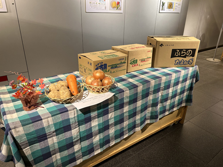 また、市場や現地へ出向き、作物の状況なども確認しながら、子どもたちに安心して食べてもらえるよう、努めています。学校給食展では、その時に出会った、生産者のみなさんや圃場の様子を写真で紹介するとともに、実際に給食で使われている青果物「じゃかいも、玉ねぎ、にんじん」の実物を展示しました。